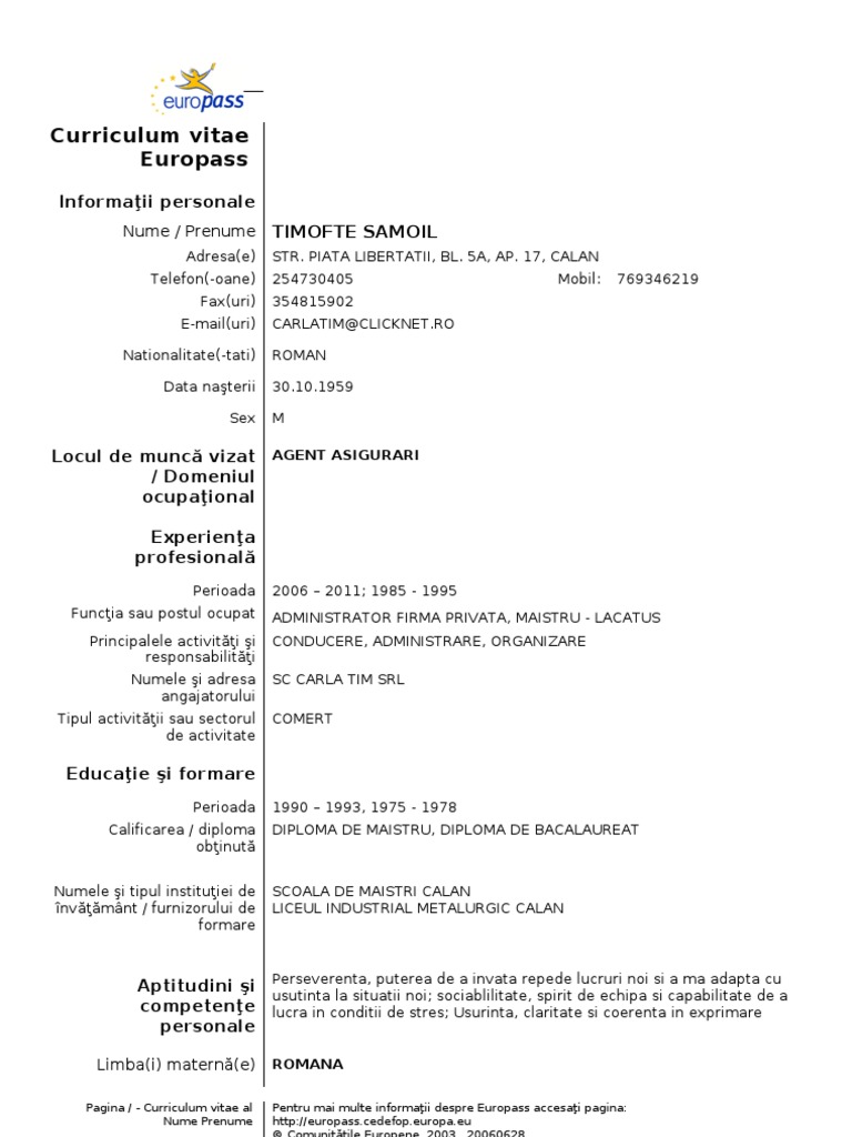 Europass Curriculum Vitae from img.yumpu.com Cv in limba engleza, model de formulare, formulare itm, formulare contabile, formulare licitatii, model de contract de mandat , contract de comodat, conventie civila, cerere de angajare, cerere de credit, cerere de demisie, cerere de divort , cerere de concediu. Limba cv in europass romana. Modele de cv european completate noul cv european holiday and , download cv european in romana si engleza simplu model de.ro , download. Curriculum vitae europass romana download the blouse. Creează curriculum vitae online română și descarcă gratuit un model de cv pdf de pe undelucram.ro. Include here any other information that may be relevant, for. Alege unul dintre modelele de mai jos și aplică astăzi. The media and news is at the tip of fingers, a push of a button, click of a switch.